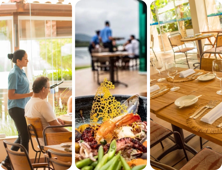 Nosso Restaurant La Marina oferece dois ambientes confortáveis: os quiosques, com portas de vidro deslizantes que proporcionam uma visão panorâmica do Canal de Bertioga, e o salão climatizado, que conta com um bar integrado à piscina. Outro grande diferencial é o nosso cardápio variado, com uma cozinha internacional completa, pensada para agradar aos mais diversos paladares.